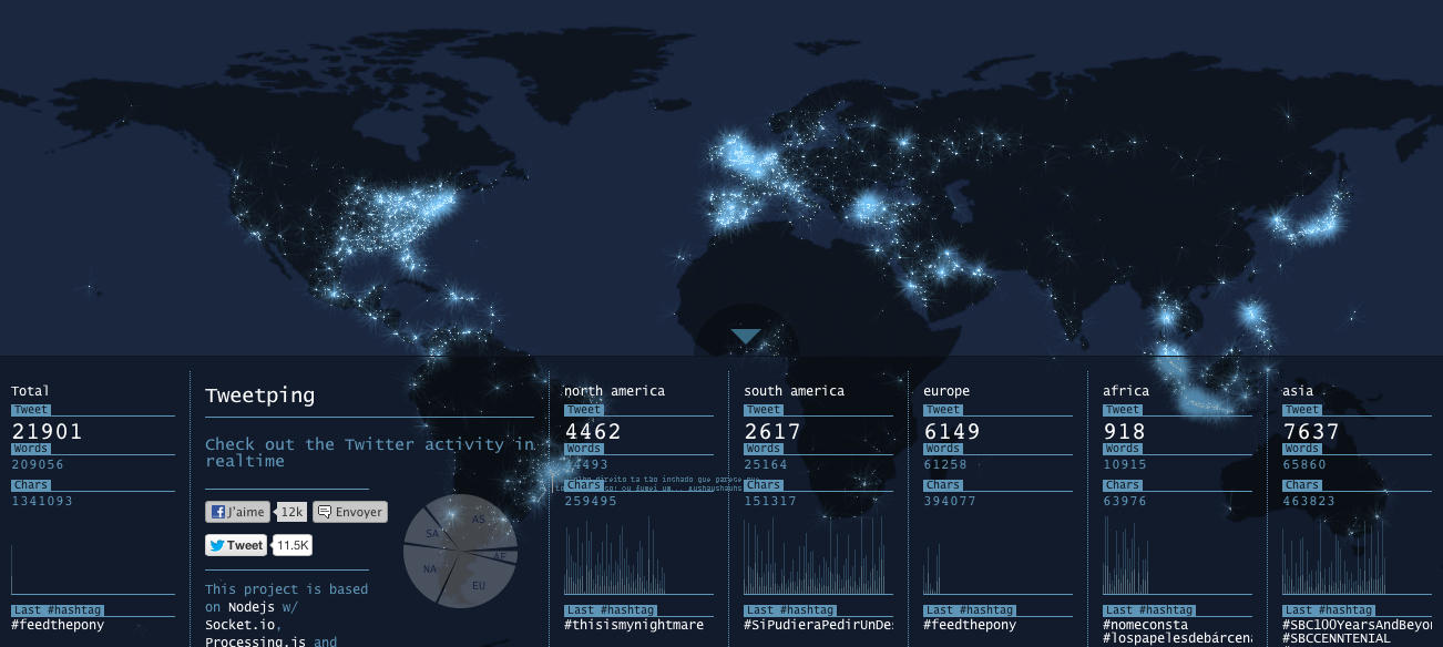 Et si vous pouviez visualiser en temps réel la localisation des tweets du monde entier ? Tweet ping est une projet créé par Franck Ernewein (eh oui un frenchy !) qui permet de découvrir à chaque seconde la progression de Twitter vue du ciel.