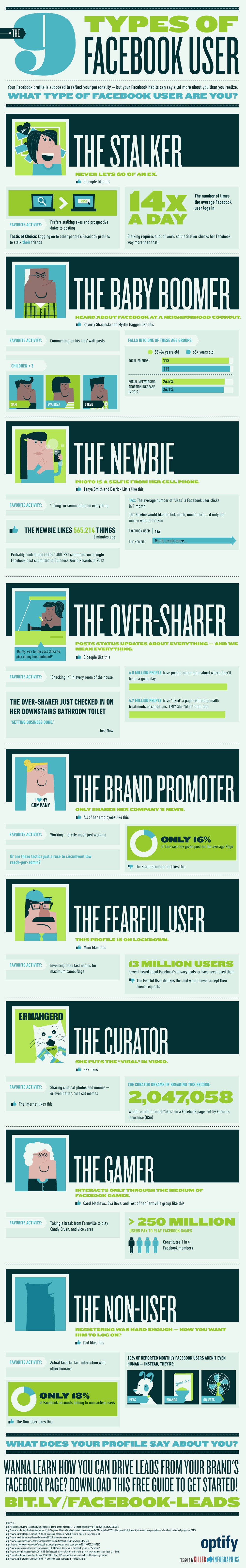 Si votre profil Facebook reflète parfois les traits de votre personnalité, vos habitudes sur Facebook en disent long sur le type d’utilisateur que vous êtes… Une infographie ludique, créée par l‘agence Optify, regroupe en neuf catégories l’ensemble des comportements typiques que l’on peut retrouver sur le réseau social. Alors, êtes-vous plutôt « stalker », « over-sharer » ou « non-user » ?