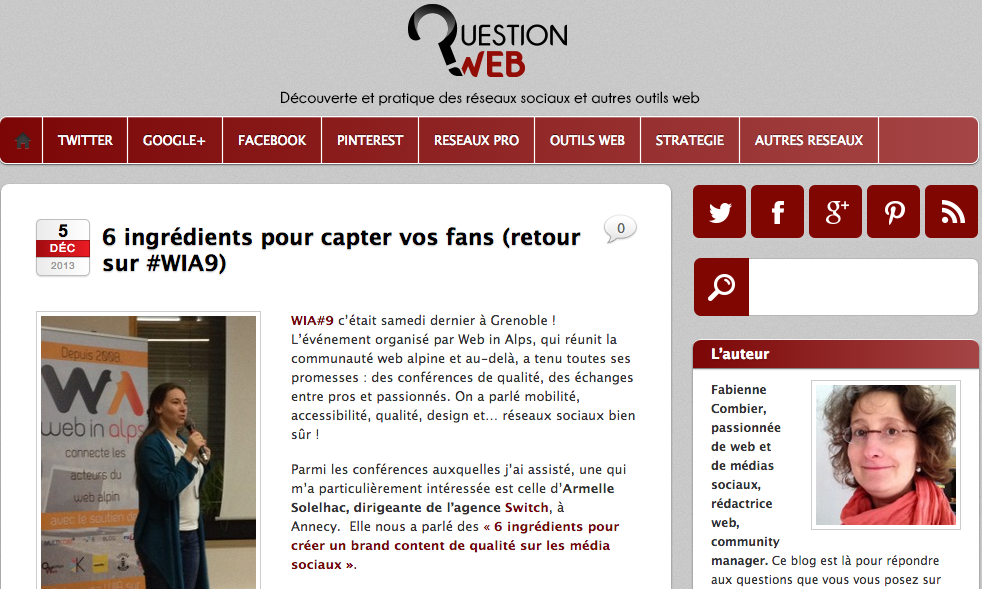 /0 Commentaires/dans Presse /par Armelle "The Boss" SolelhacLe 30 novembre dernier, nous faisions une conférence sur les ingrédients pour créer des fans dans le cadre du 9ème Web in Alps à Grenoble. La journaliste de QUESTION WEB Fabienne Combier y a assisté et a publié un petit résumé de nos propos, que vous pouvez retrouver ici et ci-dessous.