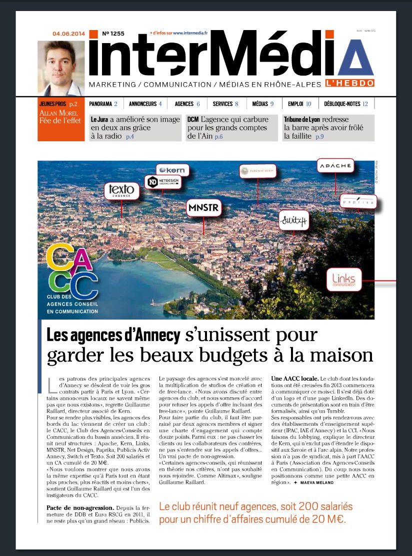 SWiTCH est membre du CACC, le Club des Agences Conseil en Communication du bassin d’Annecy, qui regroupe 9 agences et 200 salariés pour un chiffre d’affaires cumulé de 20 millions d’euros. Dans ce cadre, nous avons fait la couverture du magazine InterMedia de la semaine dernière, dont l’article était consacré à la présentation du Club et de ses objectifs.